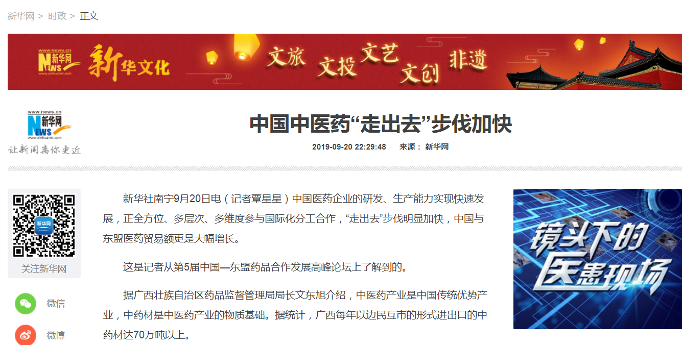 新华社南宁9月20日电(记者覃星星)中国医药企业的研发、生产能力实现快速发展,正全方位、多层次、多维度参与国际化分工合作,“走出去”步伐明显加快,中国与东盟医药贸易额更是大幅增长。