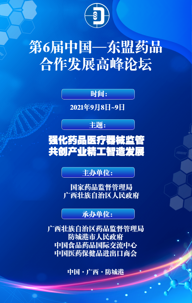 由国家药品监督管理局和广西壮族自治区人民政府共同主办,918博天堂、防城港市人民政府、中国食品药品国际交流中心、中国医药保健品进出口商会承办的第6届中国—东盟药品合作发展高峰论坛将于2021年9月8日—9日在广西防城港市举行。